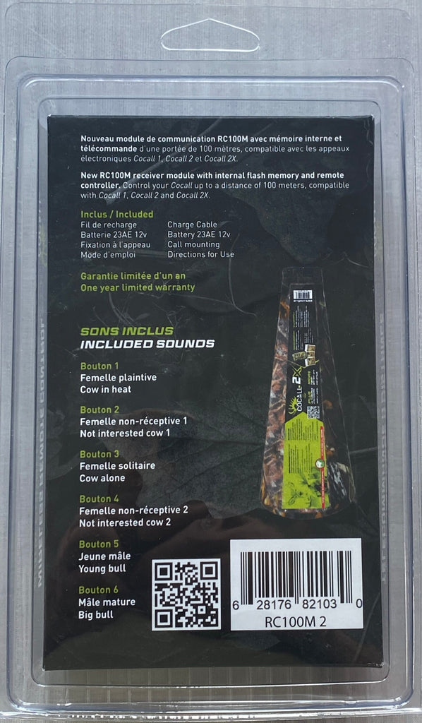 Carte microSD avec 6 sons d’orignalFil de rechargeBatterie 23AE 12vFixation à l’appeau CocallMode d’emploi